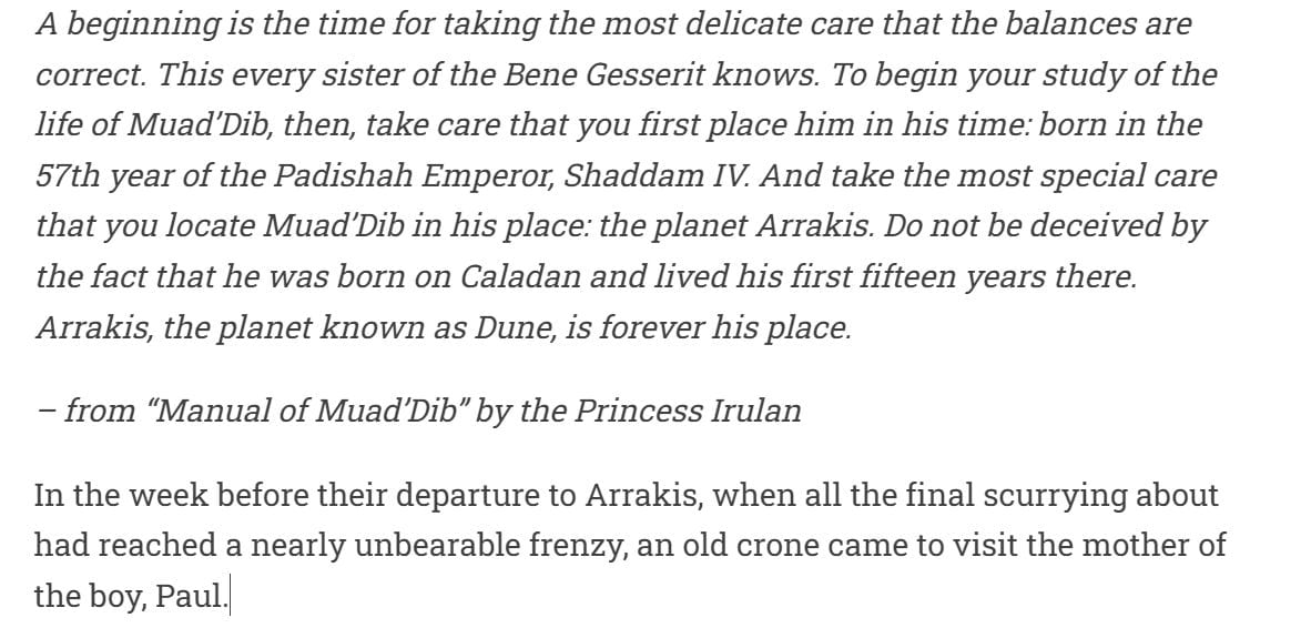 In Tolkien and Bujold, we’re hit with a lot of character up-front. In Le Guin, we get pure setting—which prefigures the actual point of the novel: the reality (or lack thereof) of political systems, boundaries, and hierarchies. The ability for reality to be collectively agreed upon. In Herbert’s work, we get setting and character slammed into us in short order: as well as tone and perspective. We know it’s a history.