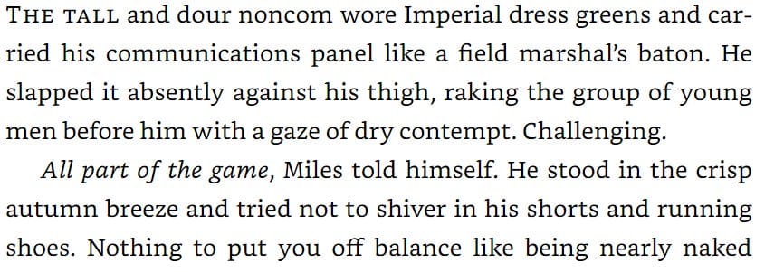 From Louis McMaster Bujold’s The Warrior’s Apprentice, which hits all my space opera buttons.