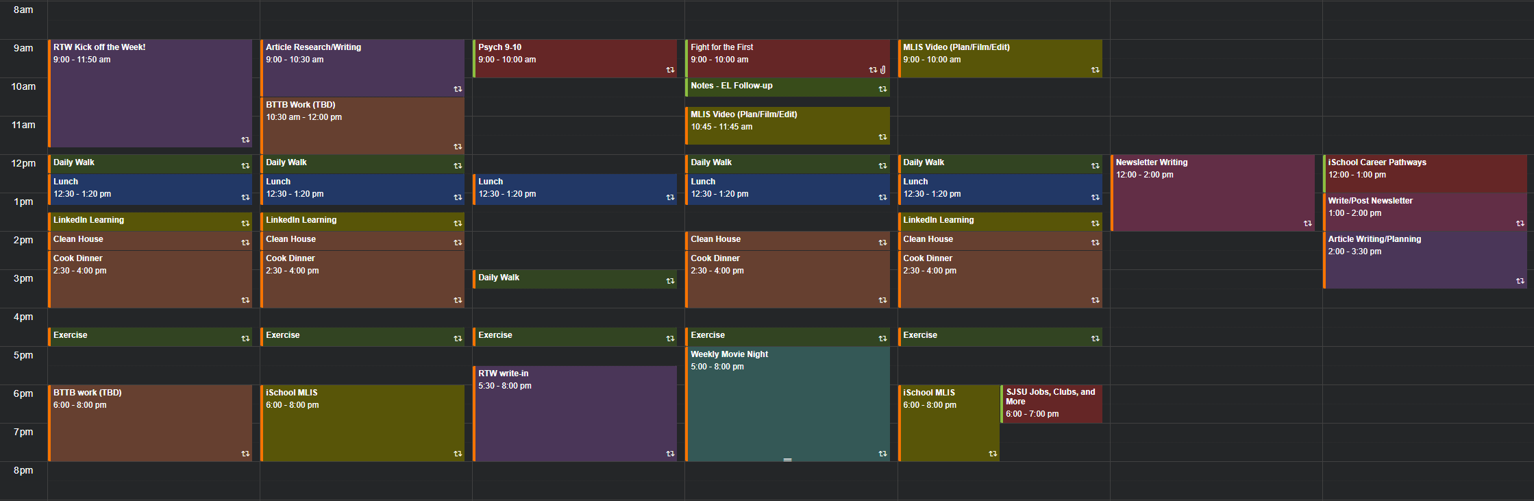 These blocks can also be moved, as needed, throughout the day. On Tuesdays, I might move my daily walk to break up my article writing and my work writing. Or, I might shift things so that my MLIS work happens on Wednesday afternoons.