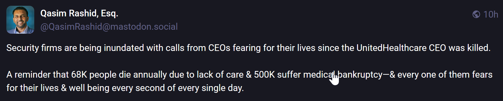 So, the CEO of UnitedHealth, Brian Thompson has been assassinated. In response, the public pages of CEOs for healthcare insurance companies around the world have vanished. Executives are clamoring to hire private security firms. The aura of fear is palpable.